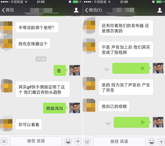 这 里指的Gif文化基因,决定了产品的社区内容倾向以及生产内容的用户特征。我们可以试着回想一下在短视频生产工具普及之前,在社交网络中传播的大部分动态 视频要么是由早期的拍客生产产生,要么是由那些热衷于玩Gif图的用户生产产生。拍客的存在服务于早期的56网、酷6以及土豆等ugc在线视频网站,而真 正混在人与人聊天与社交的场合中,传播量极其大的,又比较灵活轻量的动态视频,其实就是那部分Gif图制作用户制作出来的作品。